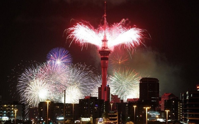 Uno de los actos principales de Nueva Zelanda para la Nochevieja son los fuegos artificiales en Sky Tower, un edificio de 328 metros de altura y una de las construcciones más emblemáticas de Auckland, ciudad situada en el norte del país.