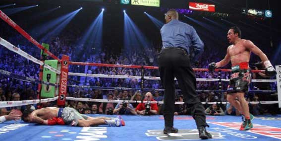 En el momento del desenlace, el 'Pacman' iba al frente en las tarjetas, pero cayó como nunca antes lo había hecho en su carrera. Los tres primeros asaltos fueron bastante parejos y con ligera ventaja para Pacquiao hasta que Márquez lo enganchó con un derechazo y lo envió a la lona por el conteo reglamentario.