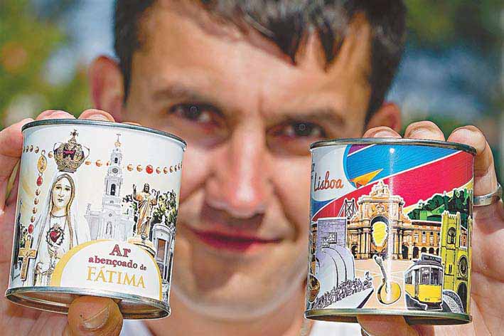 Son decenas las tiendas de recuerdos en la periferia del Santuario de Fátima, en las que ya se ofrecen artículos conmemorativos al centenario de las apariciones. Desde imágenes de la Virgen, de los pastorcitos, hasta botellas de agua y “latas con aire bendito de Fátima”.