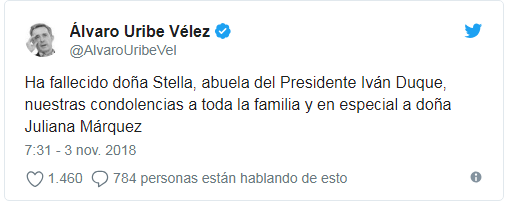 “Ha fallecido doña Stella, abuela del Presidente Iván Duque, nuestras condolencias a toda la familia y en especial a doña Juliana Márquez”, escribió Uribe.