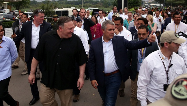 Pompeo llegó acompañado por el presidente colombiano Iván Duque juntos recorrieron los puentes Simón Bolívar y Tienditas, pasen por albergues que alojan a inmigrantes venezolanos y conozcan las bodegas donde se almacena la ayuda humanitaria.