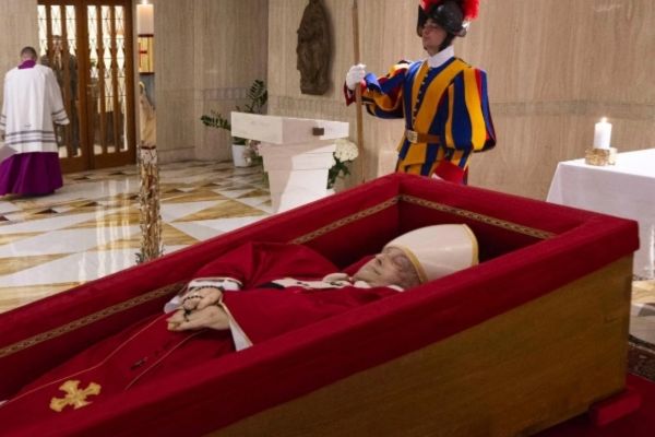 Tras las oraciones, el cuerpo del Papa Francisco, revestido con ornamentos litúrgicos rojos, la mitra y el palio, fue colocado directamente en un ataúd sencillo de madera con un revestimiento de zinc, suprimiendo el uso del catafalco, la estructura elevada donde solían exponerse los papas).