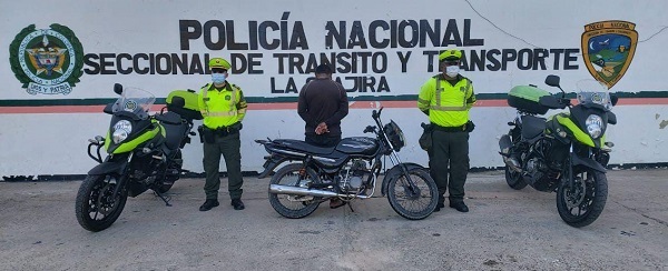 En la segunda acción de los Policías adelantada por el kilómetro 5, vía Riohacha – Paraguachón, capturaron a José Samir Vangrieken, de 25 años de edad, quien, al momento de ser requerido, se movilizaba en calidad de conductor de una motocicleta marca Bajaj, línea bóxer CT100, modelo 2011, placa STT40C, color negro, de la cual presentó la licencia de tránsito falsificada.