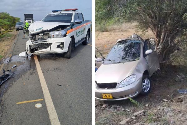 Un grave accidente de tránsito se registró en la mañana de este sábado en la vía que comunica a Santa Marta con Riohacha, exactamente a la altura del kilómetro 80, en inmediaciones del sector conocido como ‘La Pista’, donde un vehículo particular colisionó violentamente contra una camioneta de la Policía Nacional y posteriormente terminó impactando contra un árbol a un costado de la carretera.