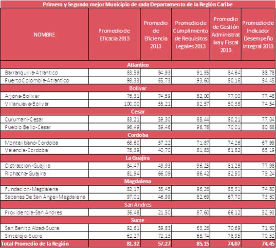 Los dos municipios que se destacaron en la valoración de Desempeño Integral fueron: Barranquilla y Puerto Colombia en el Atlántico, Arjona y Villanueva en Bolívar, Curumaní y Pueblo Bello en el Cesar, Montelíbano y Valencia en Córdoba, Distracción y Riohacha en La Guajira, Fundación y Sabanas de San Ángel en Magdalena, Providencia en el departamento de San Andrés y finalmente los municipios de San Bendito Abad y Sincelejo en Sucre.Desempeño Fiscal