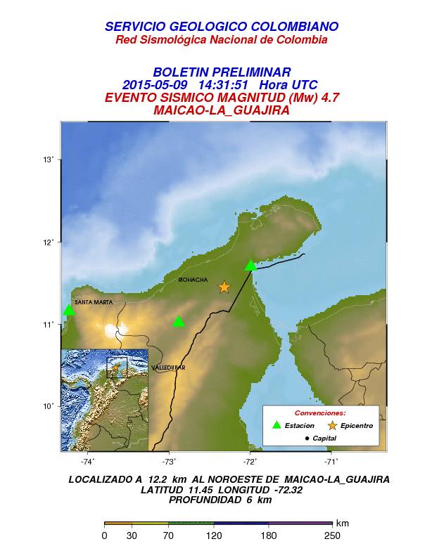 El sismo tuvo una magnitud de 4,7 sintiéndose en cinco municipios del norte de La Guajira, informó el Servicio Geologico Colombiano. Y su epicentro fue a unos 12.18 kilómetros al noroeste de la ciudad de Maicao. También se sintió en Uribia, Manaure, Albania y Fonseca, Riohacha. Por su parte, funcionarios del Sistema de Alerta Temprana de la Cruz Roja y de Corpoguajira no reportaron emergencia en la península de La Guajira.