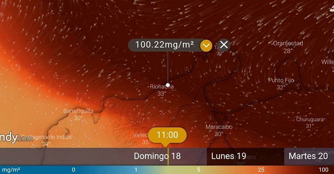 Según Corpoguajira, la nube muestra valores superiores a 100 mg/m2. Los mayores registros se presentan en la Alta Guajira con datos de hasta 170 mg/m2. Tal como se ha anunciado, se espera que el evento continúe presentándose por lo que falta del domingo e incluso extendiéndose hasta el lunes con valores parecidos a los de hoy.