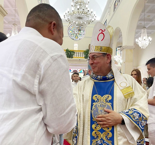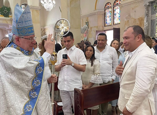 Instantes cuando el alcalde de Riohacha, José Ramiro Bermúdez Cotes, recibía la bendición de parte de monseñor Francisco Antonio Ceballos Escobar, obispo de la diócesis de Riohacha.