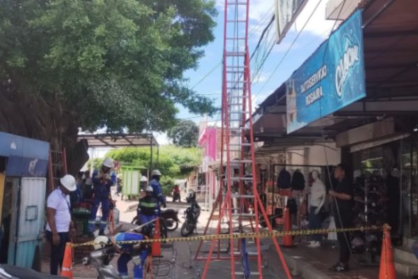 Técnicos de Air-e Intervenida atendieron una situación en el centro comercial de Fonseca, luego de que un cortocircuito interrumpiera el servicio eléctrico en varios locales de la zona.