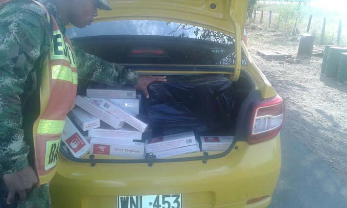 En un puesto de control ubicado en el lugar conocido como San Diego “La Sintética” de la ciudad de Valledupar, departamento del Cesar, fue detenido el taxi de placas WNI-453 cuando transportaba nueve mil quinientas cajetillas de cigarrillos marca “Silver Elephant” de contrabando, mercancía valorada en $ 33.250.000 pesos.
