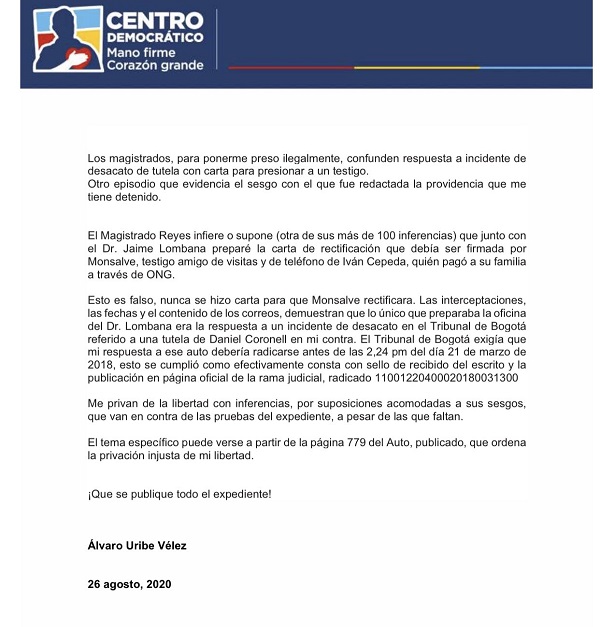 En la mañana de hoy, el expresidente Álvaro Uribe Vélez realizó un nuevo pronunciamiento por sus redes sociales, en dicho escrito y video indica que “los magistrados, para ponerme preso ilegalmente, confunden repuesta a incidente de desacato de tutela con carta para presionar a un testigo. Otro episodio que evidencia el sesgo con el que fue redactada la providencia que me tiene detenido”.