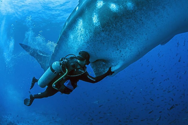 Fotografía cedida por el investigador Jonathan R. Green, muestra un tiburón ballena durante su última expedición entre el 11 y 25 de agosto, en la isla de Darwin, norte del archipiélago de las Galápagos, en Ecuador. La expedición científica, del Parque Nacional Galápagos y la Universidad San Francisco de Quito, ha logrado marcar a una decena de tiburones ballena para poder seguirles el rastro por los océanos y conocer más de cerca sus condiciones de vida y necesidades. (Foto EFE/ Jonathan R. Green)
