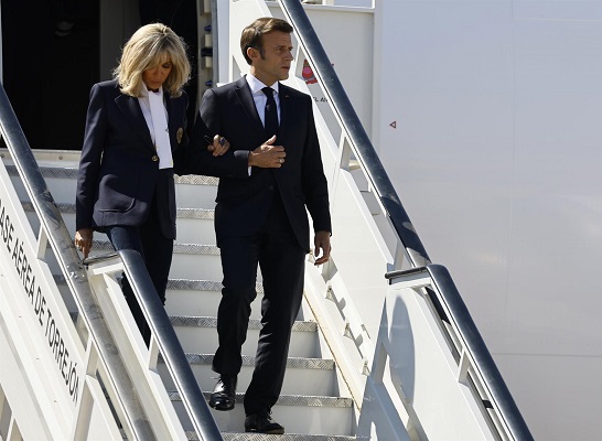 El presidente de Francia, Emmanuel Macron derecha, junto a su mujer, Brigitte Macron, izquierda, a su llegada ayer martes a la Base Aérea de Torrejón de Ardoz, en Madrid, para asistir a la cumbre de la OTAN que se celebra hasta el jueves, con la presencia de los principales líderes del mundo, y para tomar decisiones sobre la invasión de Rusia a Ucrania, una guerra que lleva mas de tres meses y miles de muertos. EFE/Sergio Pérez POOL