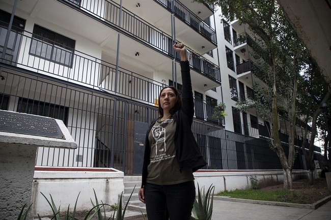 Francia Gutiérrez, damnificada del sismo del 19 de septiembre de 2017, posa frente a un conjunto habitacional ayer, en Ciudad de México, México. Las heridas que dejó el sismo del 19 de septiembre que azotó a la Ciudad de México en 2017 siguen abiertas cinco años después, pues aún más del 23 % de los damnificados no tienen vivienda y a quienes se las reconstruyeron denuncian precariedades. (Foto EFE/Isaac Esquivel)