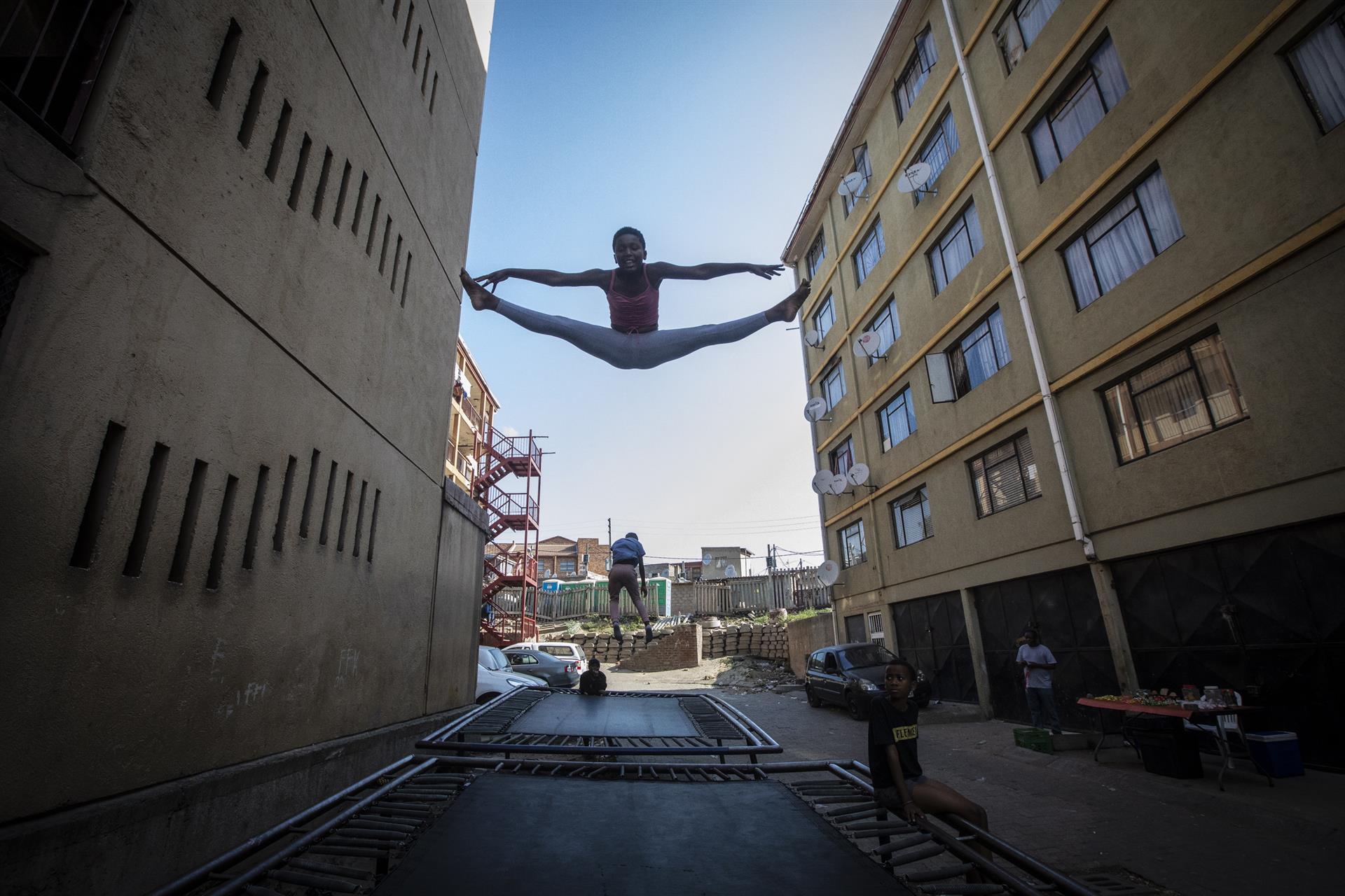 Una niña disfruta de su diversión vespertina en uno de los tres trampolines públicos en el municipio de Alexandra en Johannesburgo, Sudáfrica. Los niños saltan después de la escuela todos los días como una de las raras actividades extra en uno de los municipios más antiguos y empobrecidos de Johannesburgo. La vida en el municipio ha sido aún más dura últimamente con el aumento de los niveles de delincuencia, el aumento del desempleo y la pérdida de carga que afecta a las pequeñas empresas que forman parte del entorno macroeconómico. (Foto EFE/EPA/Kim Ludbrook)