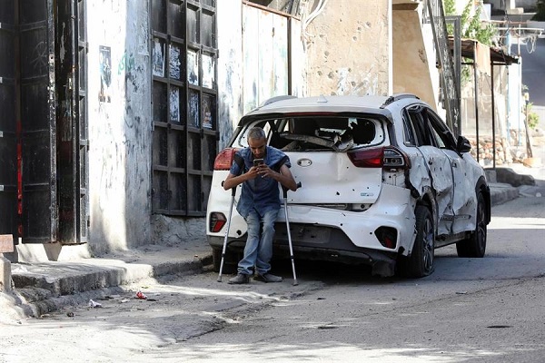 Jenin - Un hombre palestino mira su teléfono mientras está de pie junto a un automóvil dañado en el campo de refugiados después de una redada del Ejército israelí en la ciudad de Jenin, Cisjordania. Los militares anunciaron el 5 de julio la retirada de sus soldados de Yenín, tras lanzar una operación a gran escala dos días antes. Según el Ministerio de Salud palestino, 12 nacionales murieron y decenas resultaron heridos en el ataque. EFE/EPA/ALAA BADARNEH