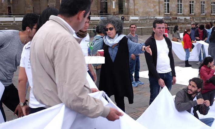 En octubre del año pasado, su obra ‘Sumando Ausencias’ se instaló en la Plaza de Bolívar con el fin de visibilizar públicamente los nombres de las víctimas que el conflicto armado ha generado por más de cinco décadas. Con cerca de 11.000 metros de tela blanca se cubrió la plaza capitalina con 2.200 nombres para rendir homenaje de manera simbólica a más de ocho millones de víctimas del conflicto.