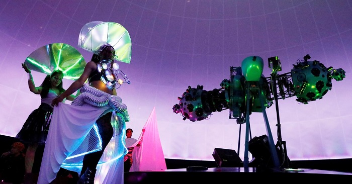 Las estrellas y constelaciones se mueven al ritmo de la música electrónica de las "House of Tupamaras", mientras en el escenario circular del Planetario, Valentina del Castillo, la maestra de ceremonias, vestida con un traje semitransparente rojo y una gran careta de luces led nos incita a comenzar el viaje.