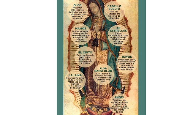 La luna: La Virgen de Guadalupe está de pie en medio de la luna, y no es casual que la palabra México en nátuahl son “Metz – xic – co” que significan “en el centro de la luna”. También es símbolo de fecundidad, nacimiento, vida. Marca los hilos de la fertilidad femenina y terrestre.